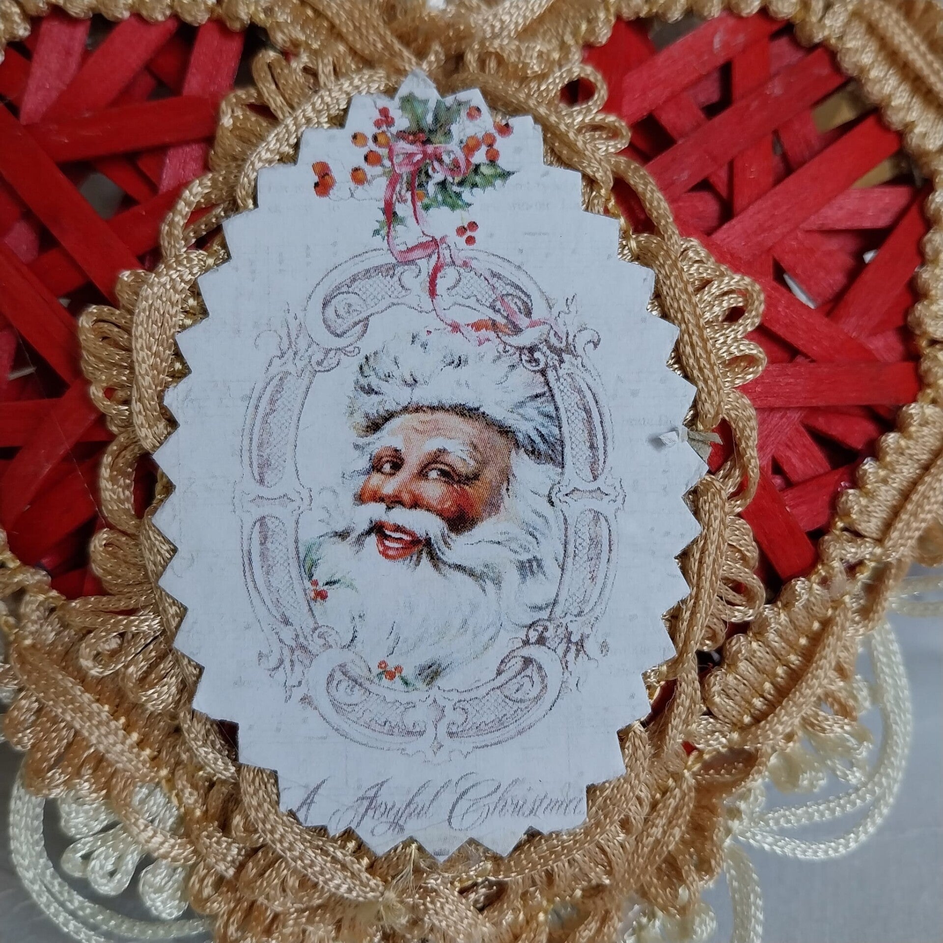 Zauberhaftes ,kleines Herz aus Holzgeflecht im weihnachtlichen Stil aufgehübscht . Ein nostalgisches Bild eingefasst mit zarter Borte.Zum Anhängen.