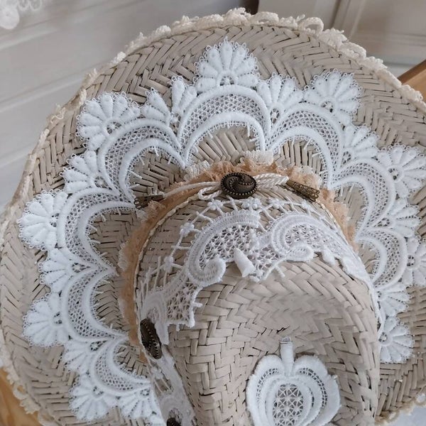Dieser zauberhafte Strohhut wurde mit viel Liebe zum Detail von mir verschönt. Vintage Spitzen und kleine Elemente zieren diesen schönen Hut .Er kann als einzigartige Dekoration an die Wand gehängt werden. Im Schlafzimmer über einer Kommode zum Beispiel oder wo auch immer Sie mögen.