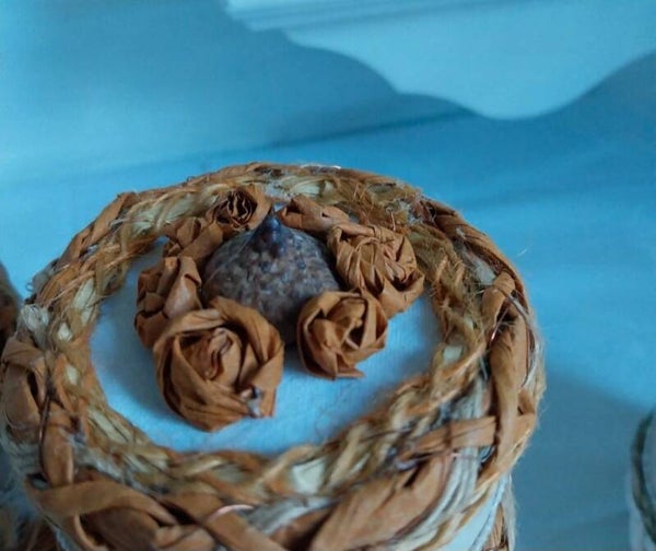 Viele schöne Details wie Vintage Spitze ,Papierblüten ,Borte,gedratetes Sisal/Jute Dekoband .