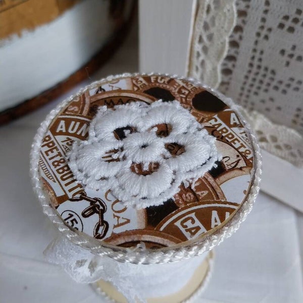 Schön gestaltete Pappspule im Nostaliestil .Auf der Spule ist weiße Wäschespitze ,ca. 10 m.(Syntetikmix)