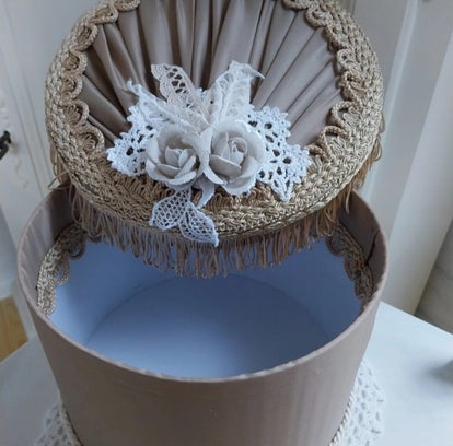 Mit viel Liebe zum Detail gestaltete Schachtel zum Aufbewahren von Schmuck oder kleinen Schätzen ,Briefen .Aufgehübscht mit Vintage Stoff Leinen /Baumwollmix in Nude ähnlich ,Vintage Häkeldeckchen ,wunderschöne Spitzen ,Rüschen ,antiken Knöpfen ,antiken Applikationen (Plauener Spitze ) und handgefertigten Stoffrosen .