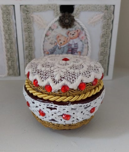 Süße Dekoschachtel im Nostalgiestil .Kreiert mit Vintage Materialien . Wunderschöne Posamentenborte,Fransenborte ,Spitze alles liebevoll auf einander abgestimmt. Als schöne Deko auf einer hübschen Kommode oder in einer Vitrine.