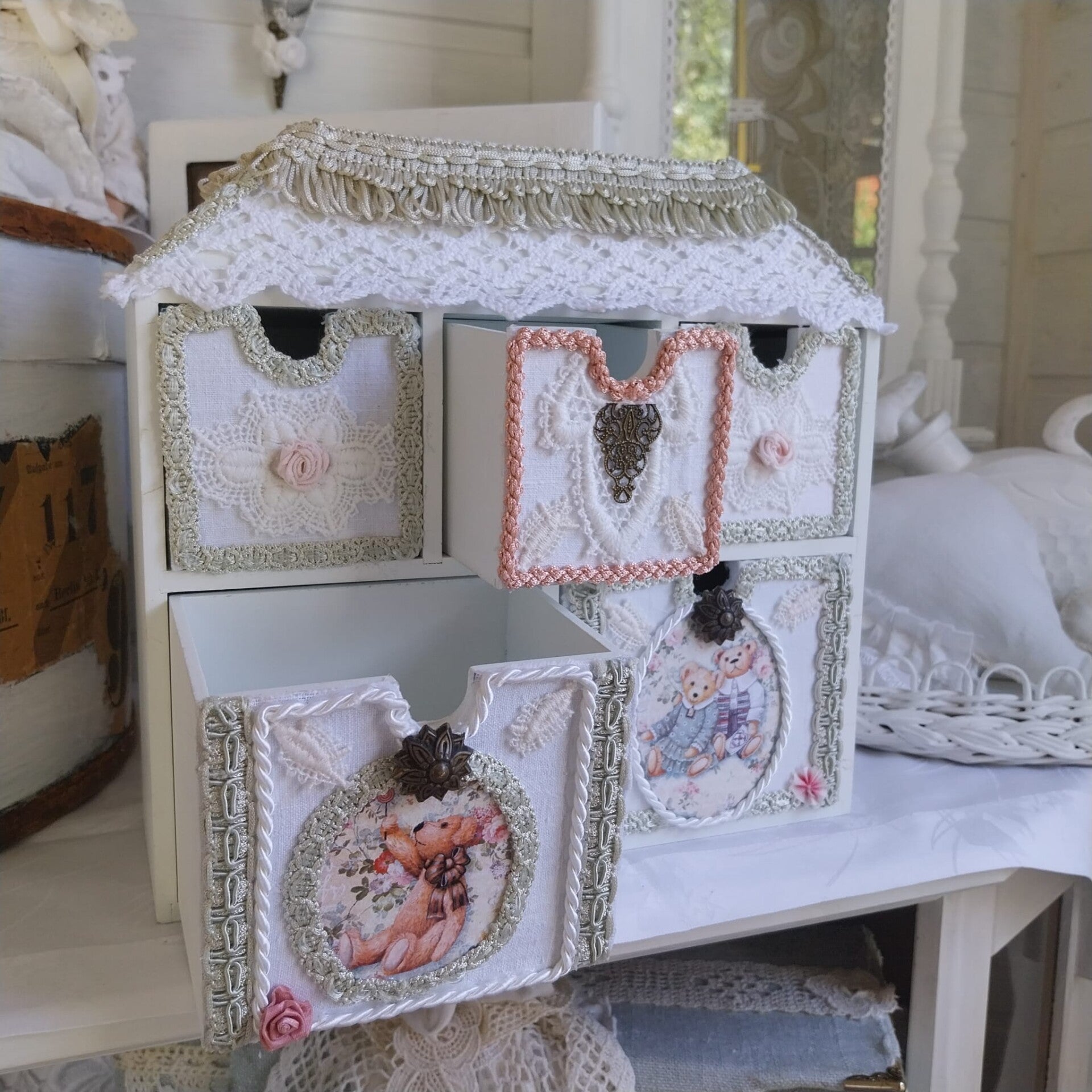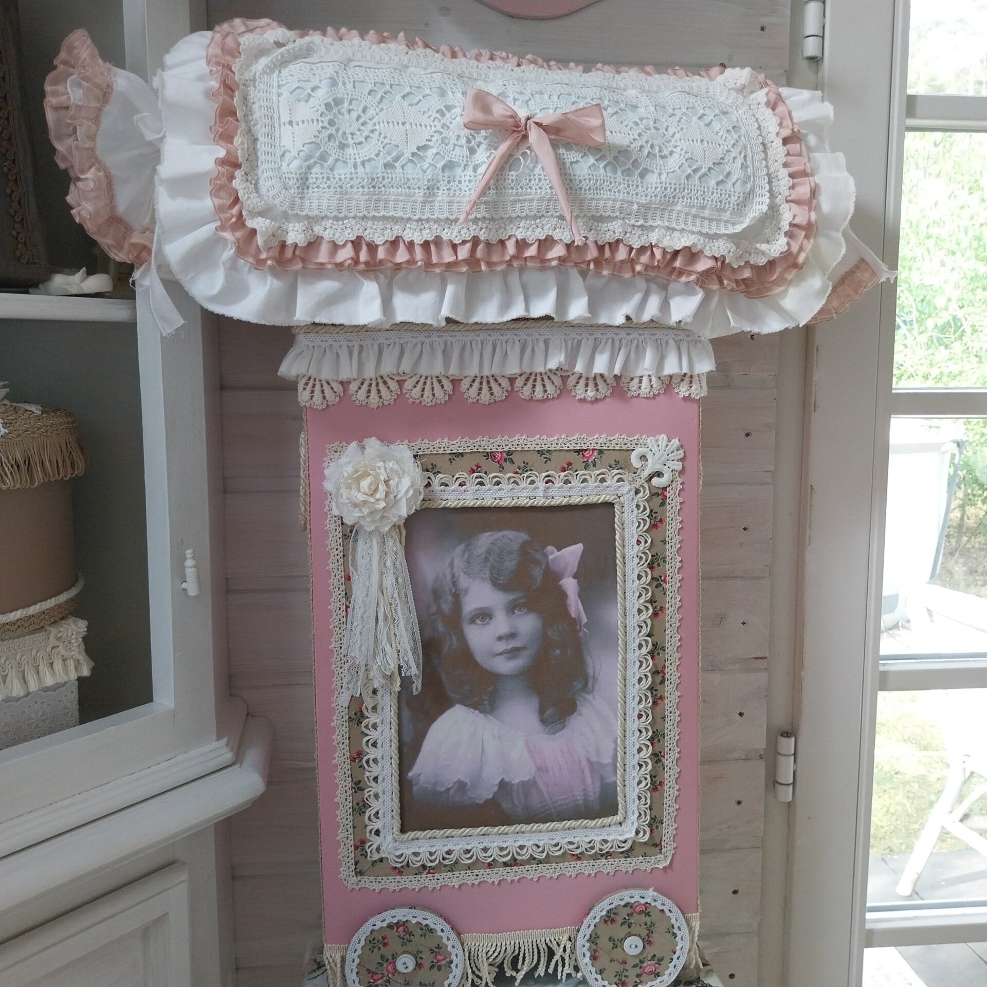 Ganz zauberhafte gestaltete Holzspule im Nostalgiestil mit viel Liebe zum Detail.