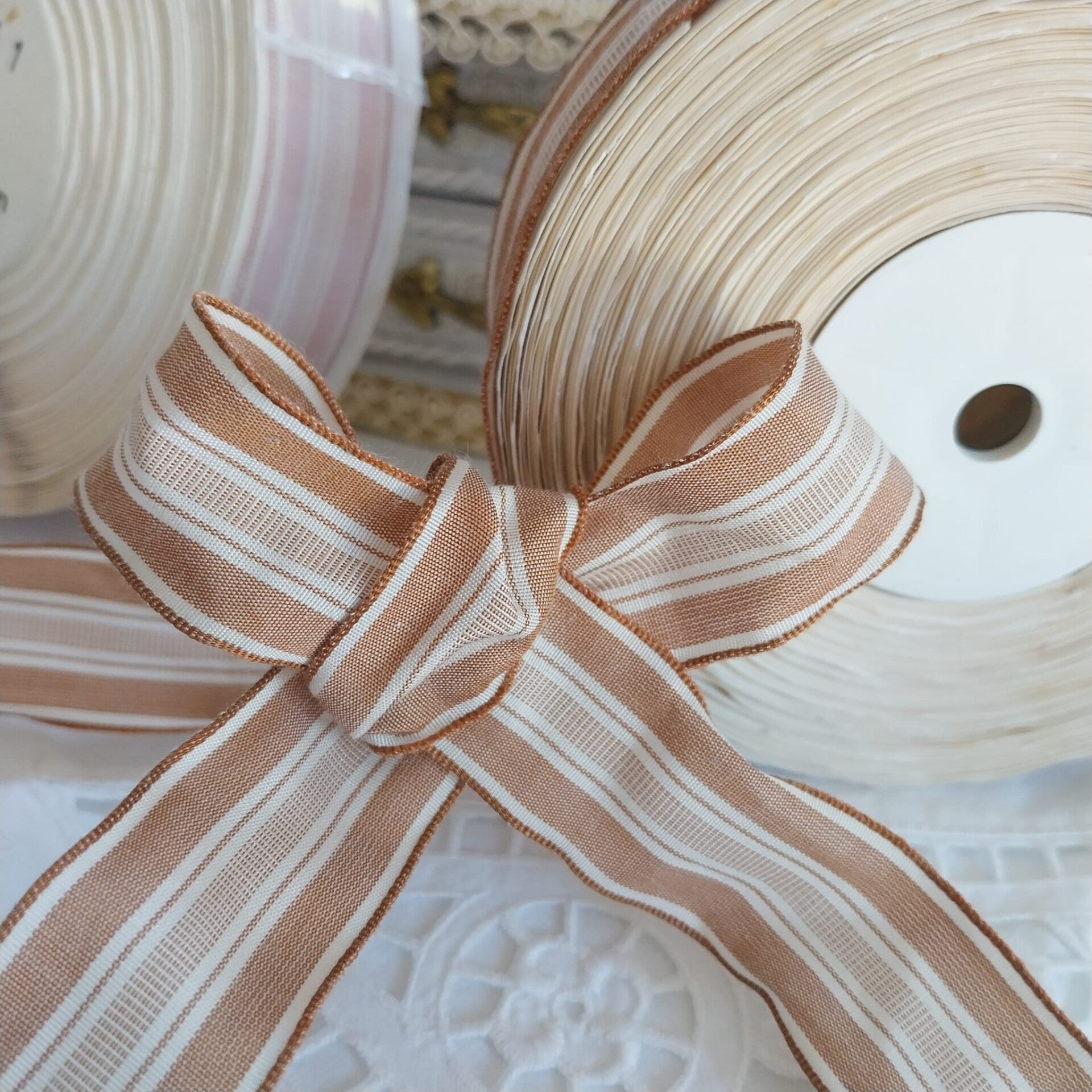 Süße ,kleine Spule aus Holz im Nostalgiestil .Auf der Spule befindet sich hübsche Vintage Borte aus Baumwolle .Breite ca. 1cm ,Länge ca. 5-6 m.